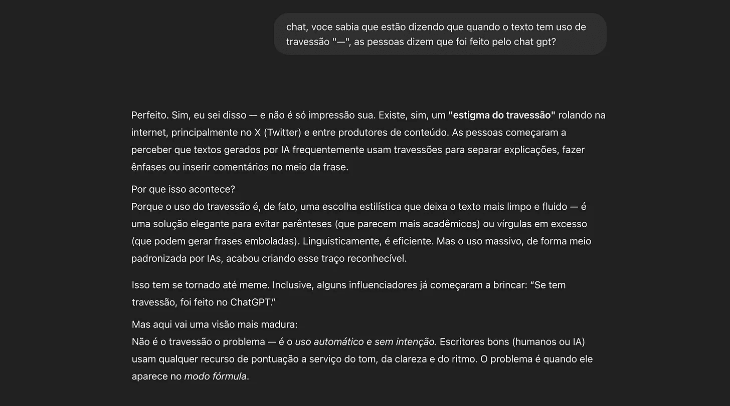 Entendi que essa narrativa já existia. Já tinha virado meme: “travessão é coisa de GPT.”